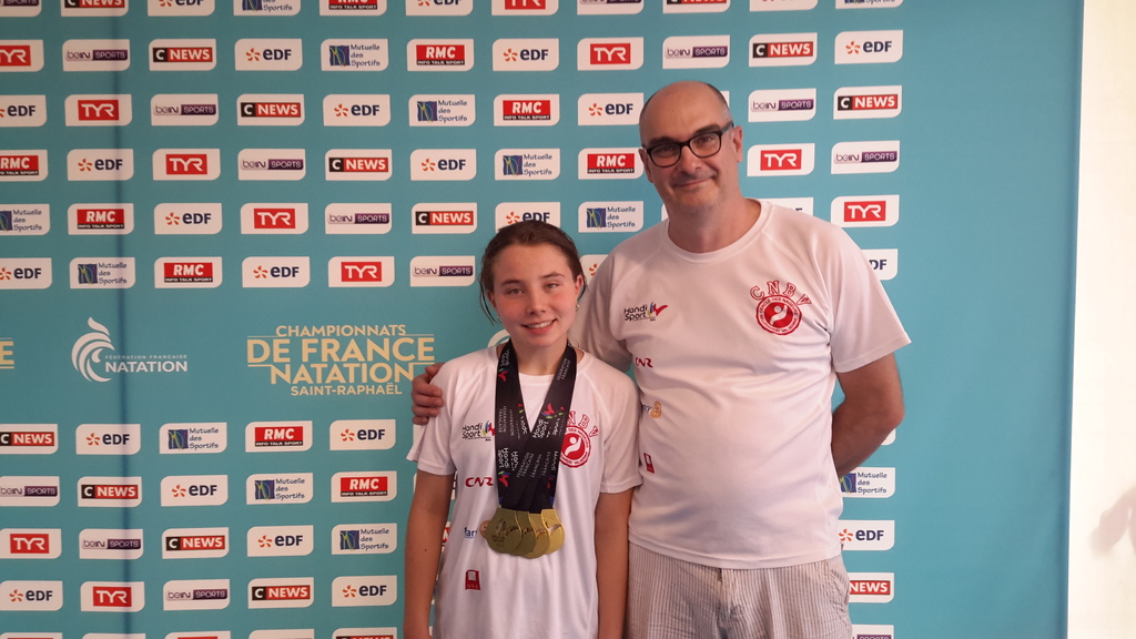 Une semaine chargée et pleine d’émotion pour la nageuse Manon Haab du CNBV section Handisport. En effet Manon a participé du 22 au 27 mai au Championnat de France N1 Elite où les meilleurs nageurs de l’élite français valides et personnes en situation d’handicap se sont partagés le Stade Nautique Alain Chateigner de 50m de Saint-Raphaël. Etaient présents notamment en valide Charlotte Bonnet, Mehdy Metella, Jeremy Stravius, et en handisport Elodie Lorandi, Théo Curin, David Smetanine tous connus sur le circuit international. Ils étaient près de 250 nageurs filles/garçons valides, 18 nageurs handicapés et 15 nageuses handicapées ayant atteint la grille de sélection pour participer à ce Championnat. Manon avec ses 13 ans était la plus jeune nageuse et de loin, elle ne s’est pas laissé démonter, la preuve en est les 4 médailles qu’elle remporte sur les 7 nages sélectionnées. Dans le classement Handisport féminin, les résultats pour Manon sont honorables : 12ième au 50m Nage Libre, 12ième au 100m Nage Libre, 4ième au 400m Nage Libre, 3ième au 200 4 Nages, 3ième au 50m Brasse, 1ière au 50m Dos et 1ière au 50m Pap. De belles performances pour sa première participation et nous pouvons noter sa combativité lors de la finale du 200m 4 Nages où elle a su passer de la 6ième place lors des séries du matin à la 3ième marche du podium en finale l’après-midi. Elle a créé la belle surprise au bord du bassin et bravo pour sa rage !